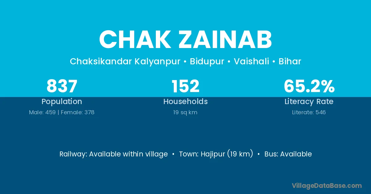 Hajipur (19 km) is the nearest town to Chak Zainab village for major economic activities and is located approximately 19 km away.