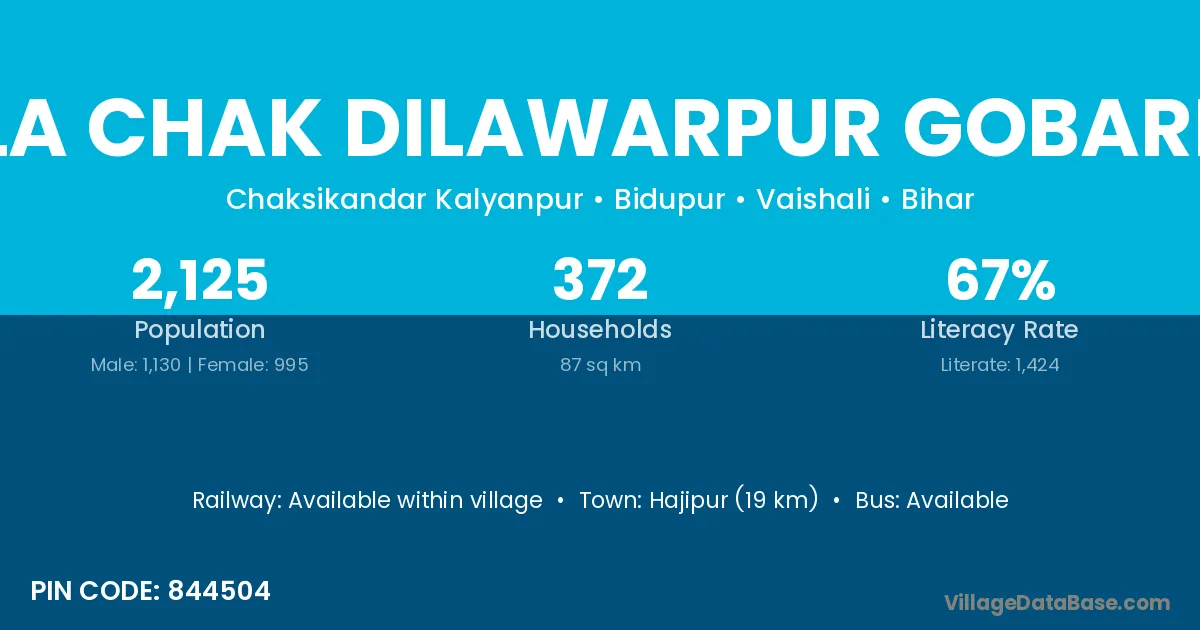 Hajipur (19 km) is the nearest town to Kaila Chak Dilawarpur Gobardha village for major economic activities and is located approximately 19 km away.