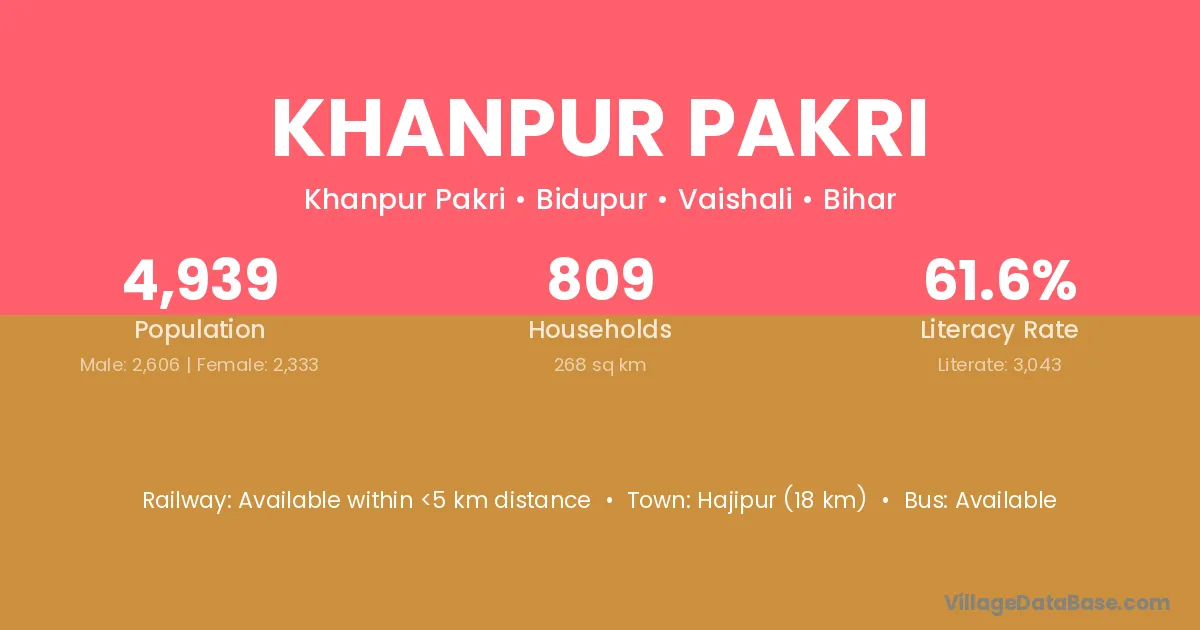 Hajipur (18 km) is the nearest town to Khanpur Pakri village for major economic activities and is located approximately 18 km away.