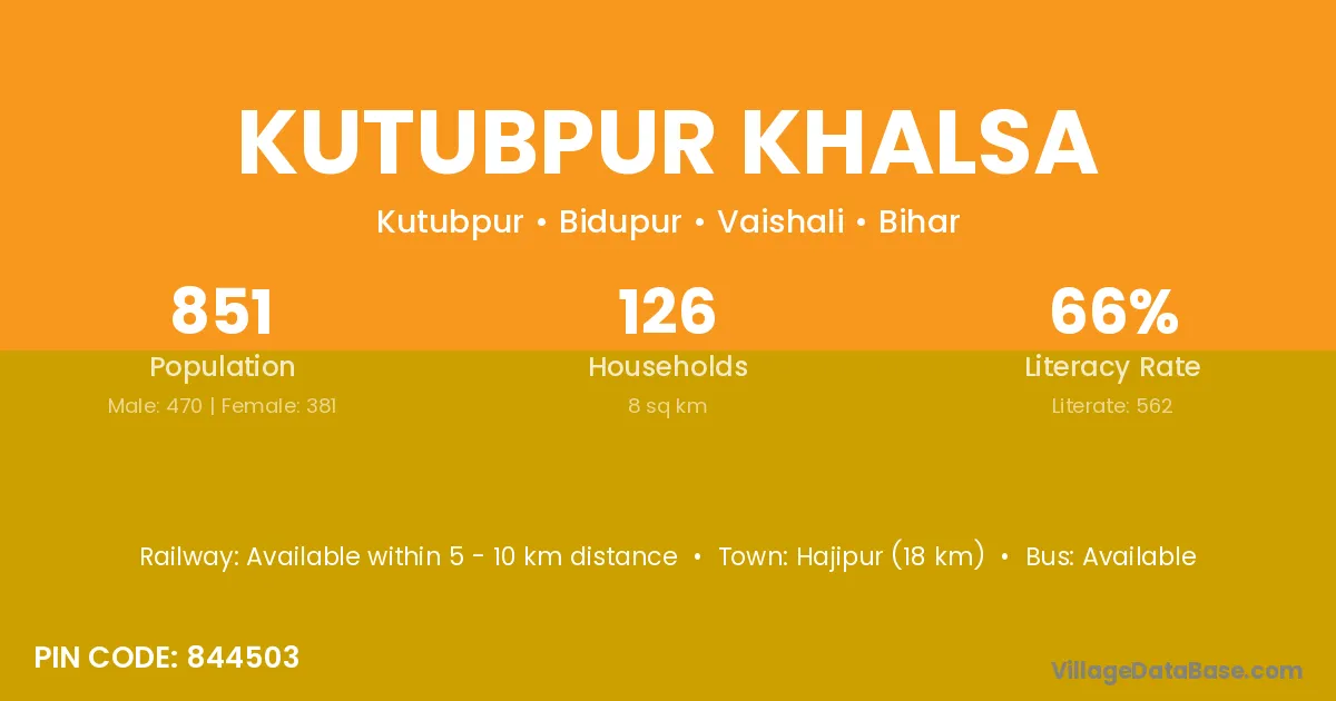 Hajipur (18 km) is the nearest town to Kutubpur Khalsa village for major economic activities and is located approximately 18 km away.