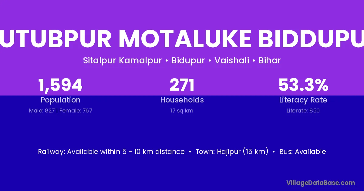 Kutubpur Motaluke Biddupur village has a total population of 1,594 people, of which 827 are males and 767 are females.