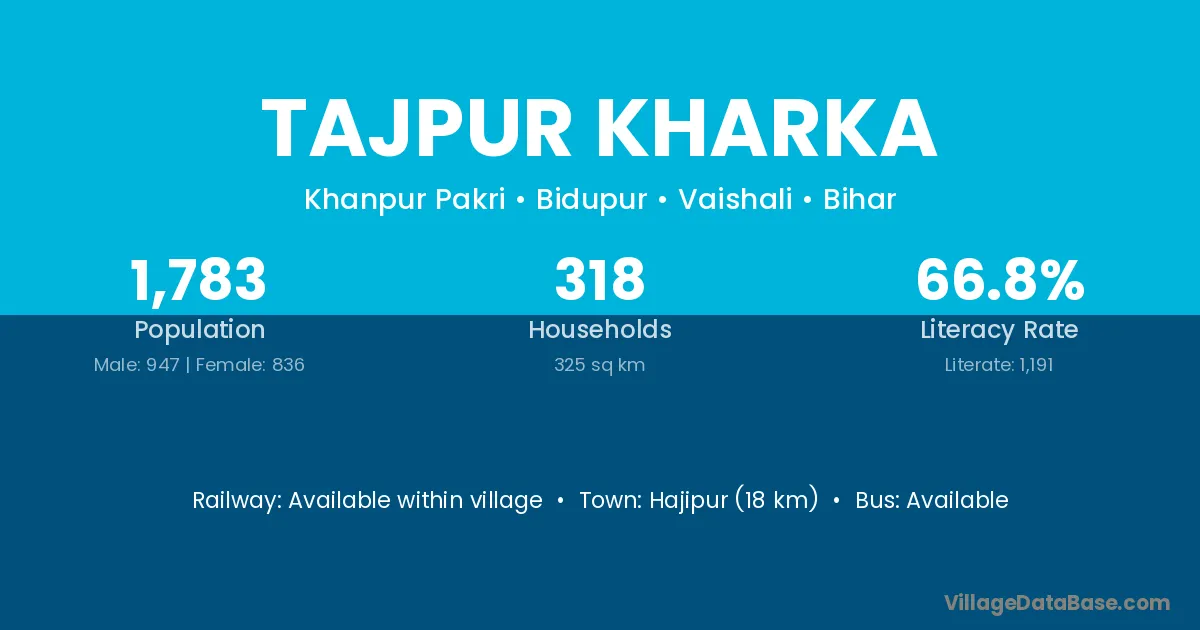 Hajipur (18 km) is the nearest town to Tajpur Kharka village for major economic activities and is located approximately 18 km away.