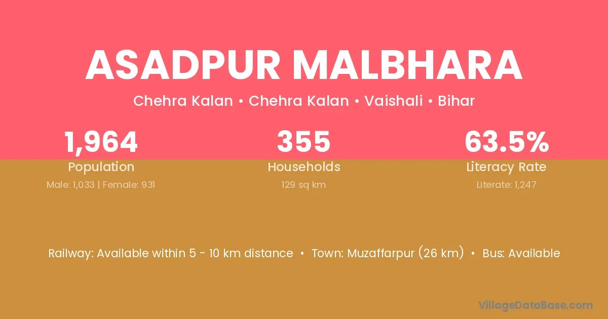 Muzaffarpur (26 km) is the nearest town to Asadpur Malbhara village for major economic activities and is located approximately 26 km away.