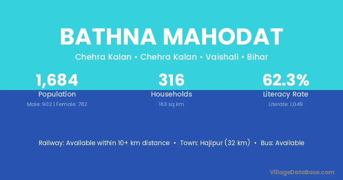 Hajipur (32 km) is the nearest town to Bathna Mahodat village for major economic activities and is located approximately 32 km away.