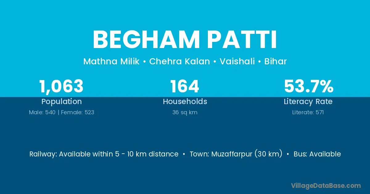 Muzaffarpur (30 km) is the nearest town to Begham Patti village for major economic activities and is located approximately 30 km away.