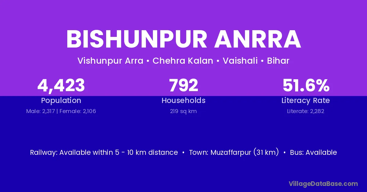 Muzaffarpur (31 km) is the nearest town to Bishunpur Anrra village for major economic activities and is located approximately 31 km away.