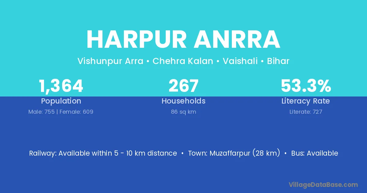 Muzaffarpur (28 km) is the nearest town to Harpur Anrra village for major economic activities and is located approximately 28 km away.
