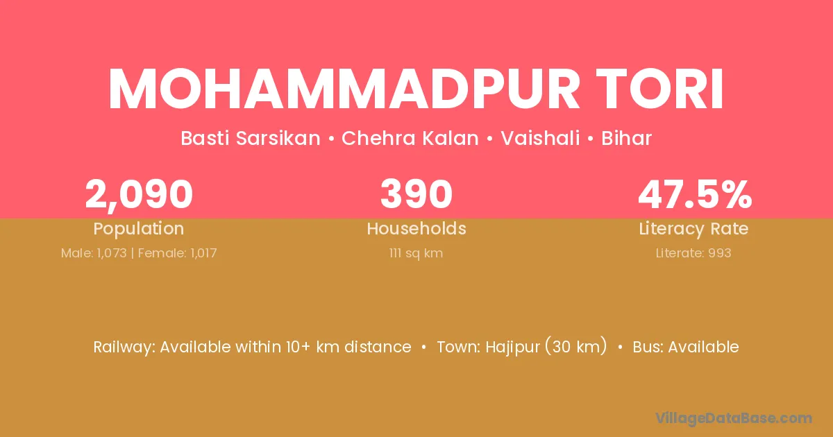 Mohammadpur Tori village has a total population of 2,090 people, of which 1,073 are males and 1,017 are females.
