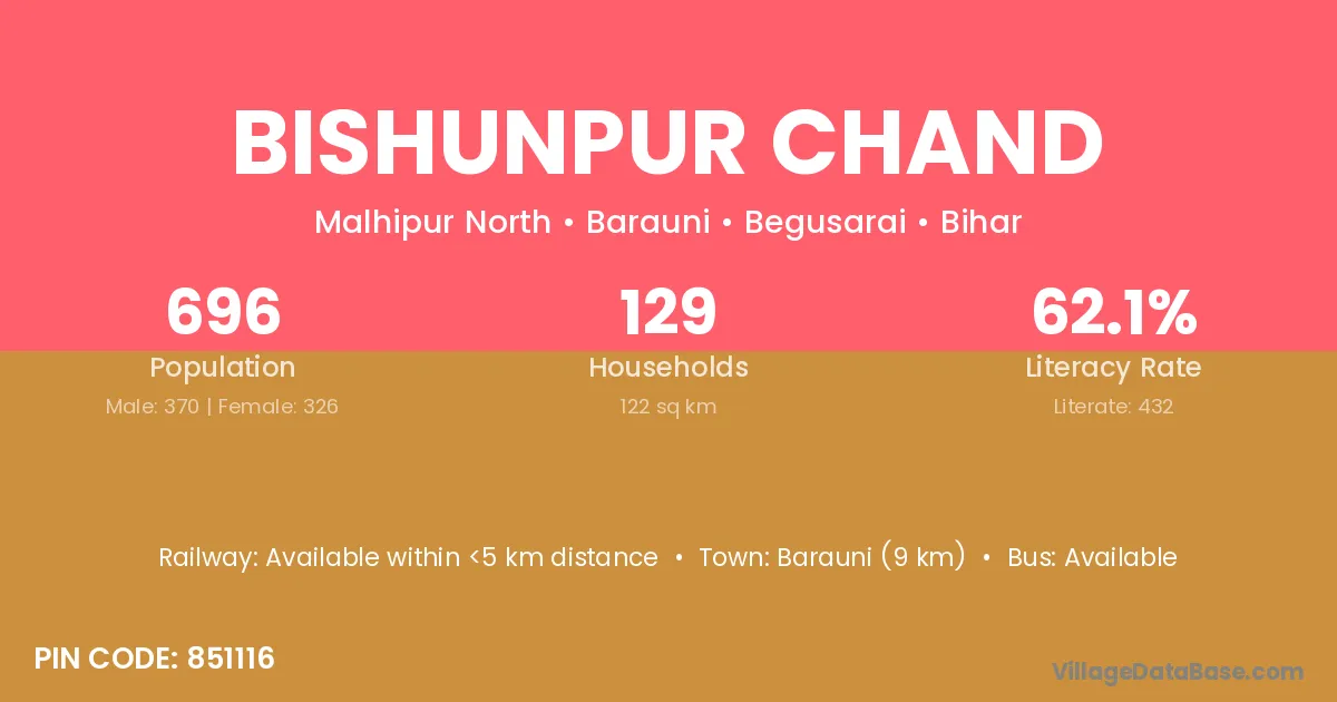 The literacy rate of Bishunpur Chand village is 61.63%. Male literacy stands at 69.18% and female literacy at 53.36%.