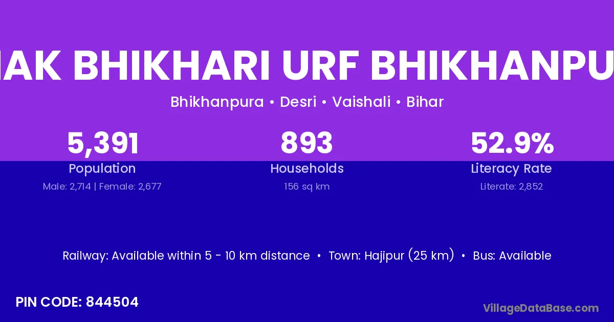 Chak Bhikhari Urf Bhikhanpura village has a total population of 5,391 people, of which 2,714 are males and 2,677 are females.