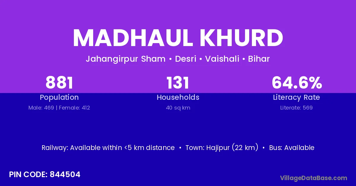 Hajipur (22 km) is the nearest town to Madhaul Khurd village for major economic activities and is located approximately 22 km away.