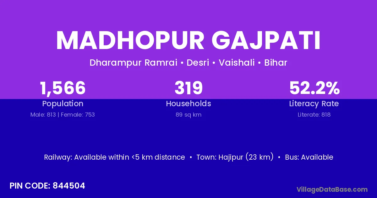 Hajipur (23 km) is the nearest town to Madhopur Gajpati village for major economic activities and is located approximately 23 km away.