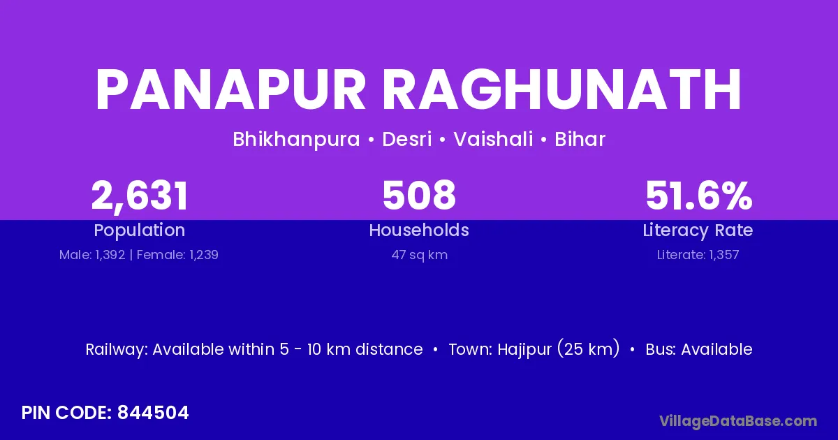 Hajipur (25 km) is the nearest town to Panapur Raghunath village for major economic activities and is located approximately 25 km away.