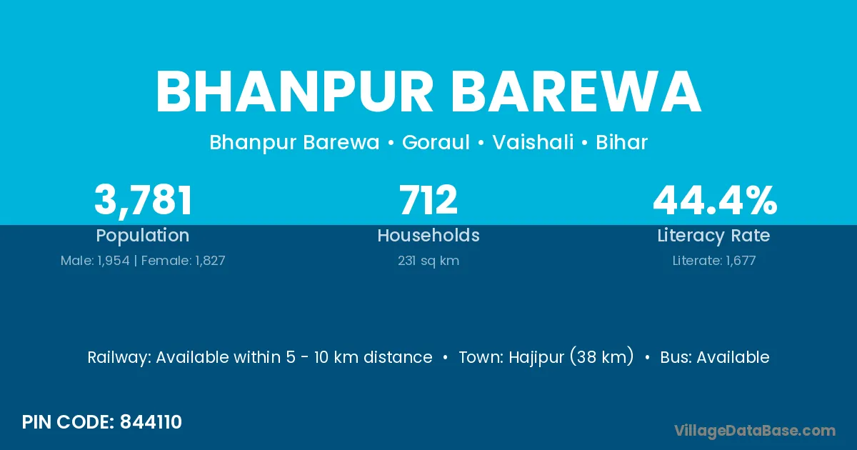 Hajipur (38 km) is the nearest town to Bhanpur Barewa village for major economic activities and is located approximately 38 km away.
