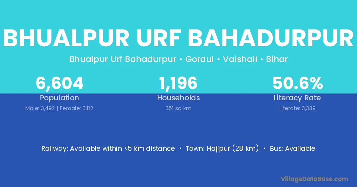 Hajipur (28 km) is the nearest town to Bhualpur Urf Bahadurpur village for major economic activities and is located approximately 28 km away.