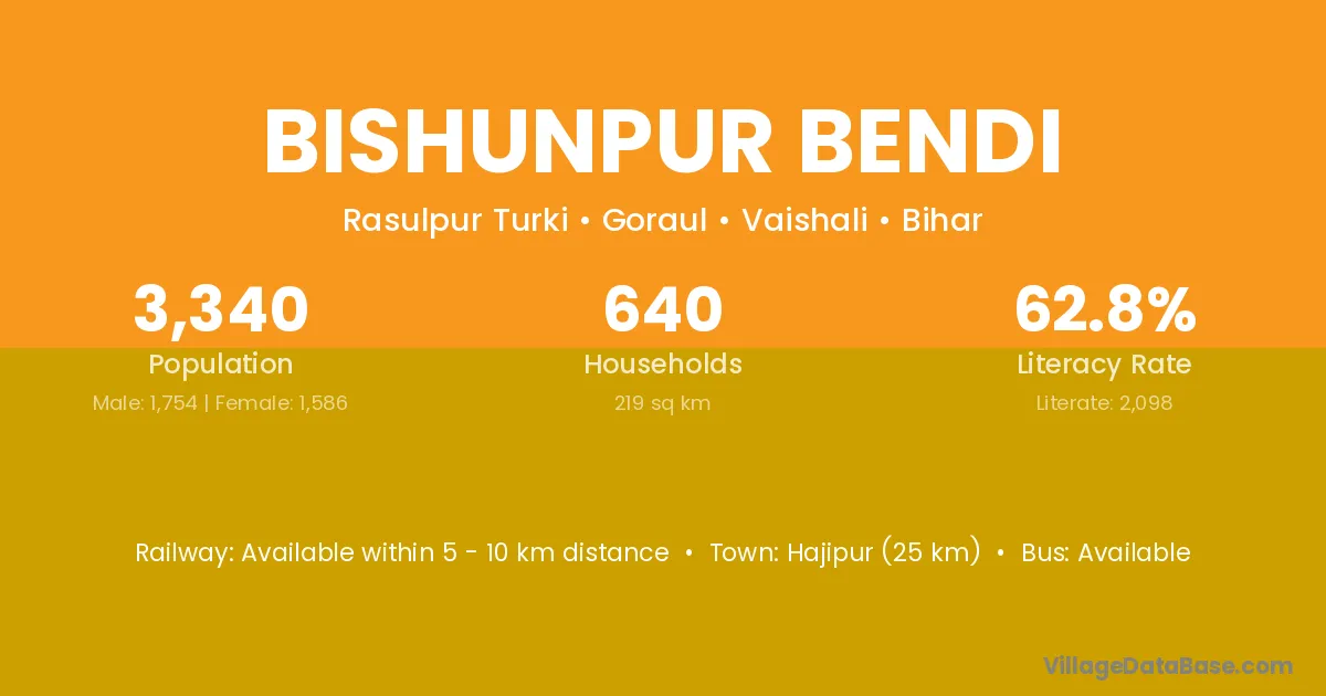 Hajipur (25 km) is the nearest town to Bishunpur Bendi village for major economic activities and is located approximately 25 km away.