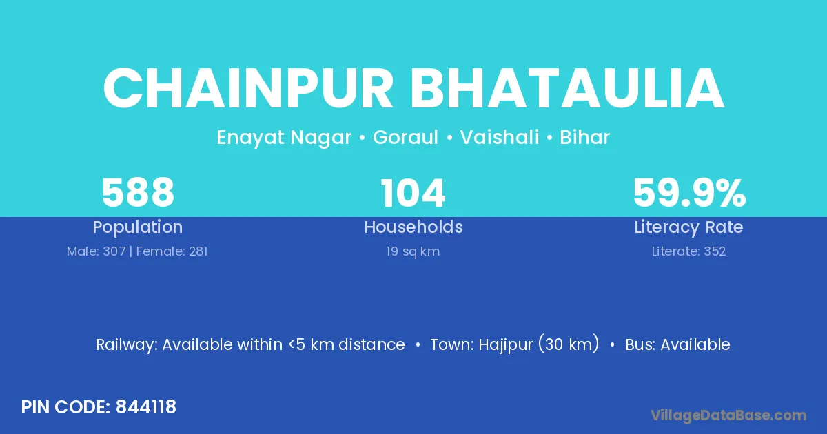 Hajipur (30 km) is the nearest town to Chainpur Bhataulia village for major economic activities and is located approximately 30 km away.