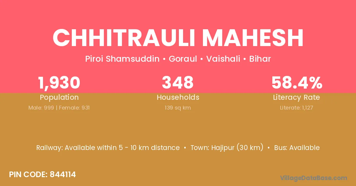 Hajipur (30 km) is the nearest town to Chhitrauli Mahesh village for major economic activities and is located approximately 30 km away.