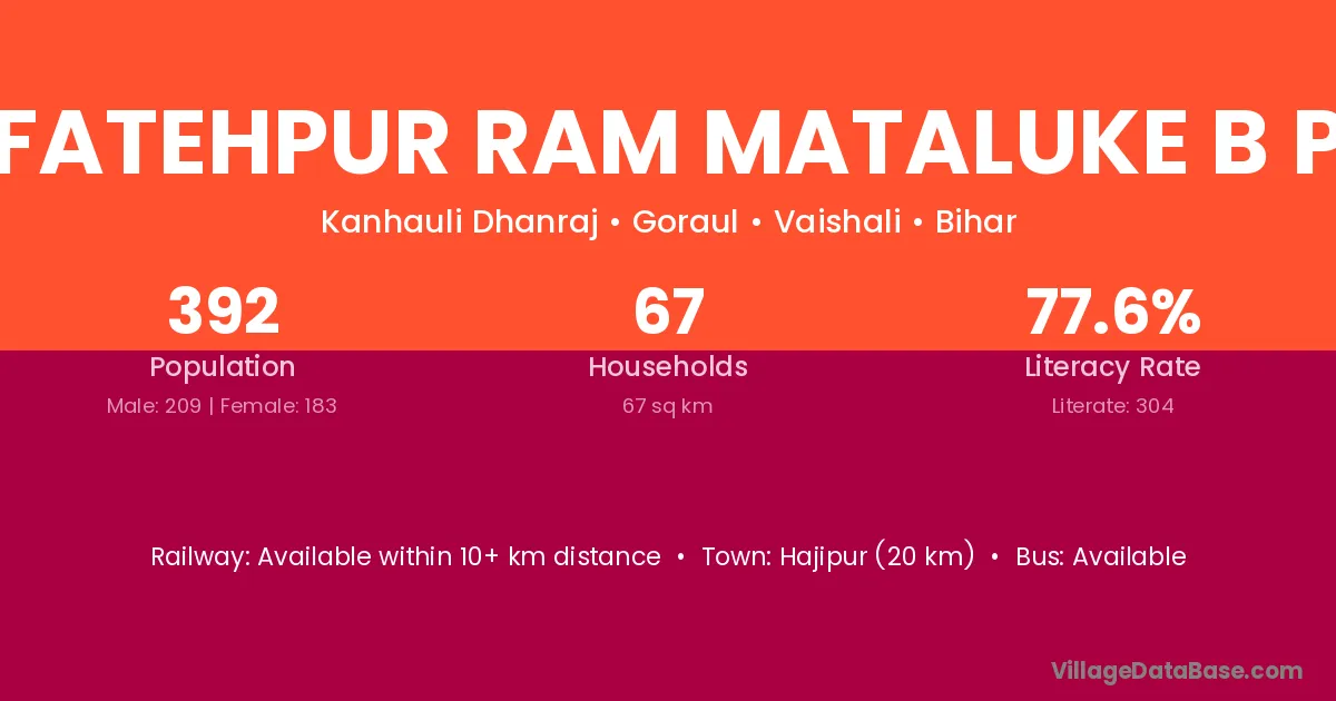 Hajipur (20 km) is the nearest town to Fatehpur Ram Mataluke B P village for major economic activities and is located approximately 20 km away.
