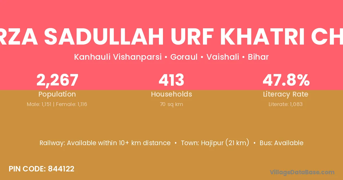 Hajipur (21 km) is the nearest town to Mirza Sadullah Urf Khatri Chak village for major economic activities and is located approximately 21 km away.