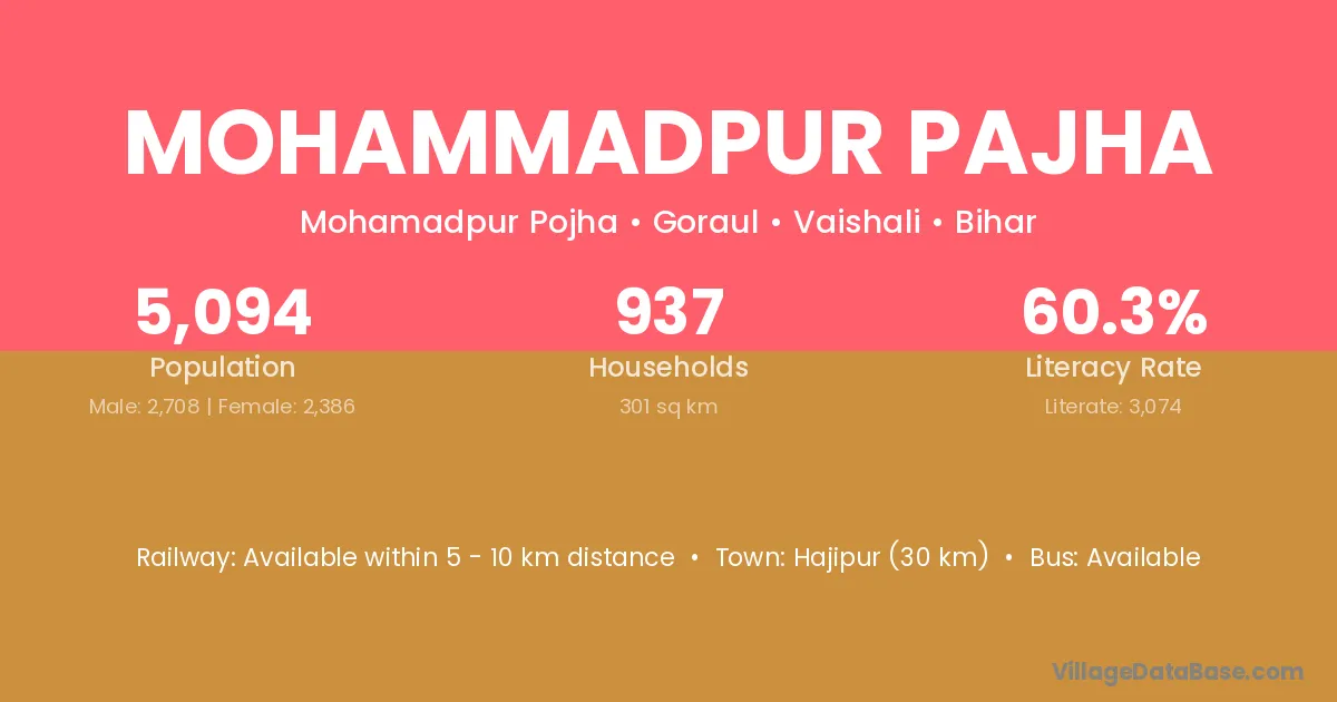 Mohammadpur Pajha village has a total population of 5,094 people, of which 2,708 are males and 2,386 are females.