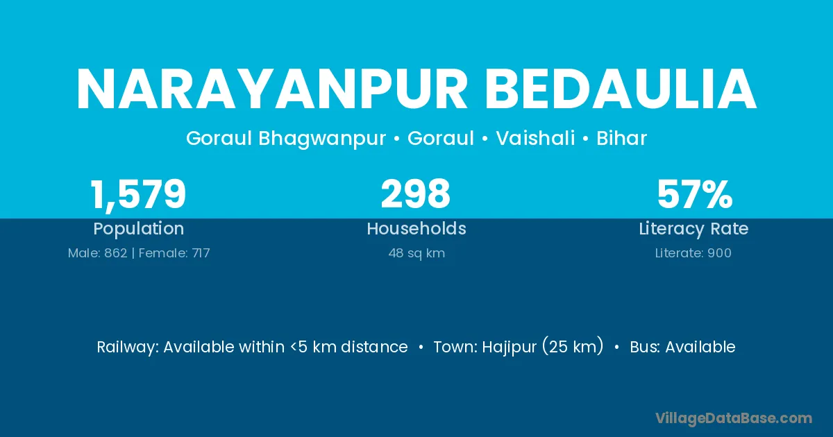Narayanpur Bedaulia village has a total population of 1,579 people, of which 862 are males and 717 are females.
