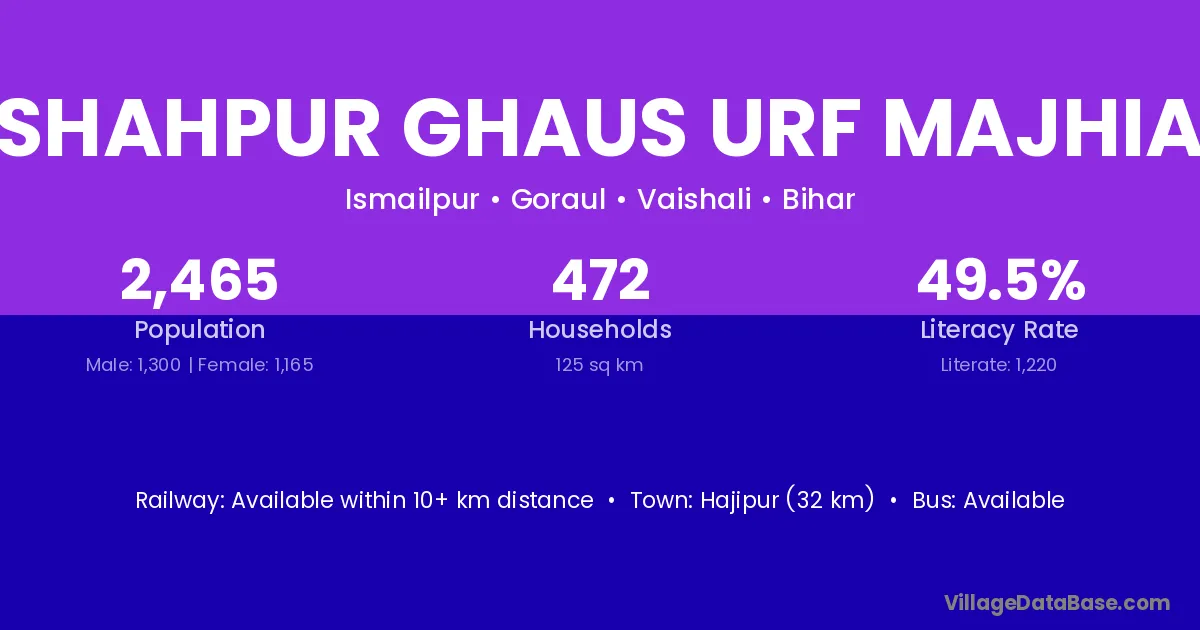 Hajipur (32 km) is the nearest town to Shahpur Ghaus Urf Majhia village for major economic activities and is located approximately 32 km away.