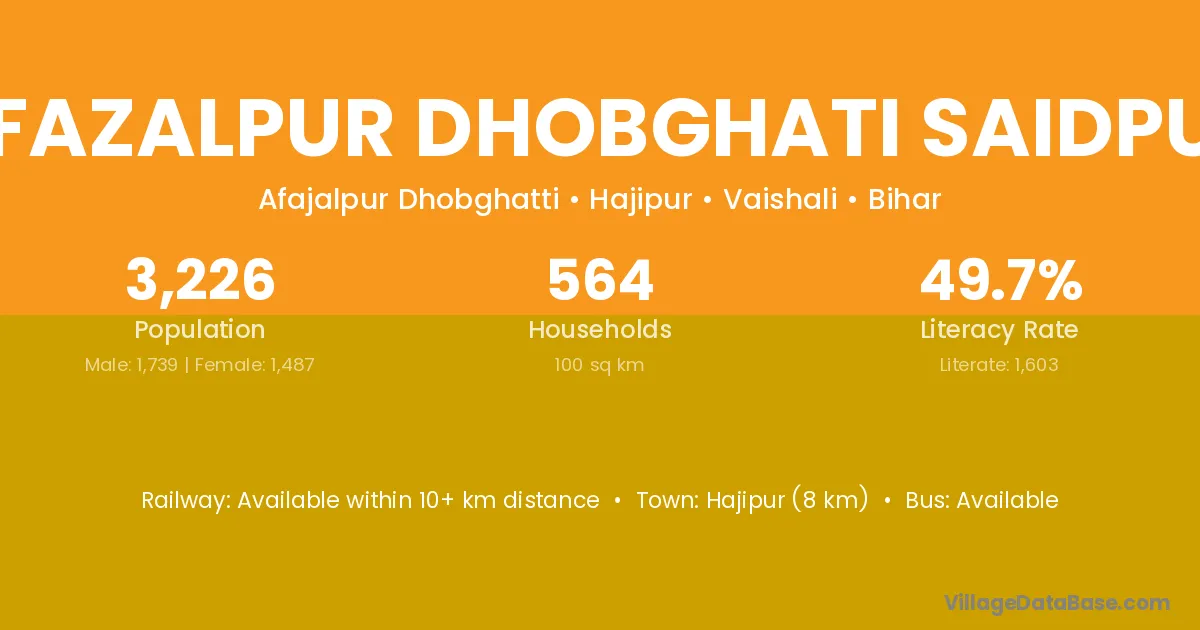 Hajipur (8 km) is the nearest town to Afazalpur Dhobghati Saidpur village for major economic activities and is located approximately 8 km away.
