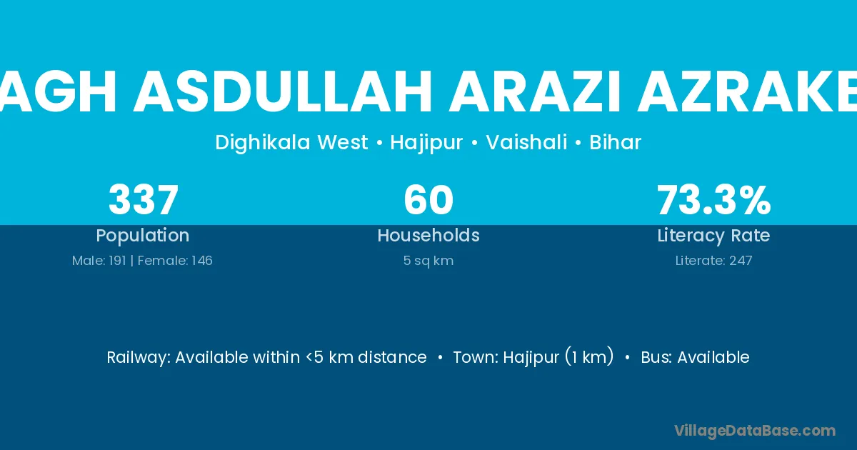 Hajipur (1 km) is the nearest town to Bagh Asdullah Arazi Azrakbe village for major economic activities and is located approximately 1 km away.