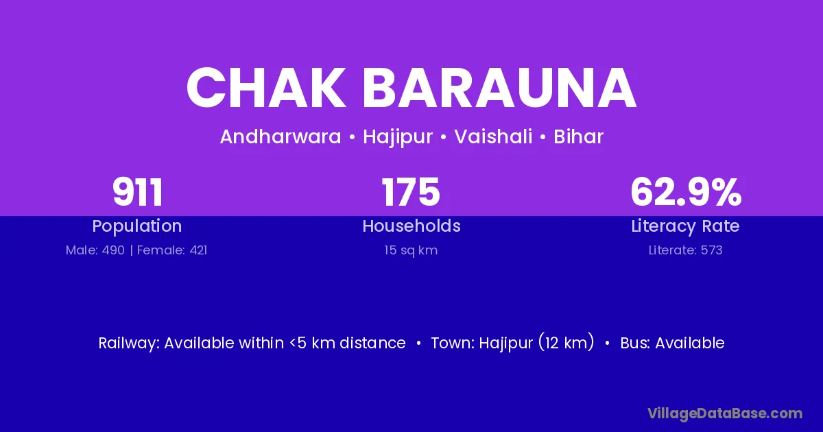 Hajipur (12 km) is the nearest town to Chak Barauna village for major economic activities and is located approximately 12 km away.