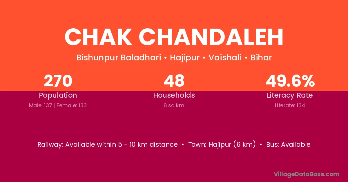 Hajipur (6 km) is the nearest town to Chak Chandaleh village for major economic activities and is located approximately 6 km away.