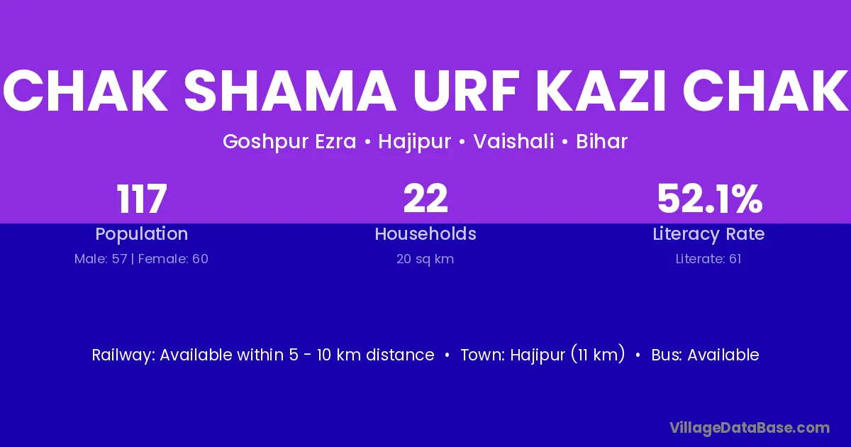 Hajipur (11 km) is the nearest town to Chak Shama Urf Kazi Chak village for major economic activities and is located approximately 11 km away.