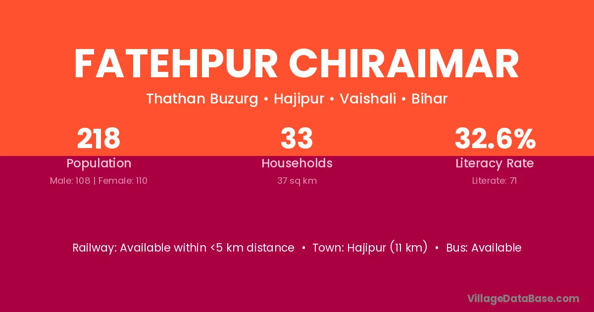 Hajipur (11 km) is the nearest town to Fatehpur Chiraimar village for major economic activities and is located approximately 11 km away.