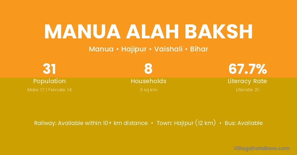 Hajipur (12 km) is the nearest town to Manua Alah Baksh village for major economic activities and is located approximately 12 km away.