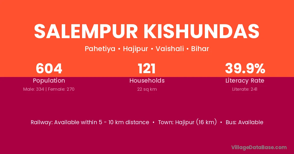 Hajipur (16 km) is the nearest town to Salempur Kishundas village for major economic activities and is located approximately 16 km away.