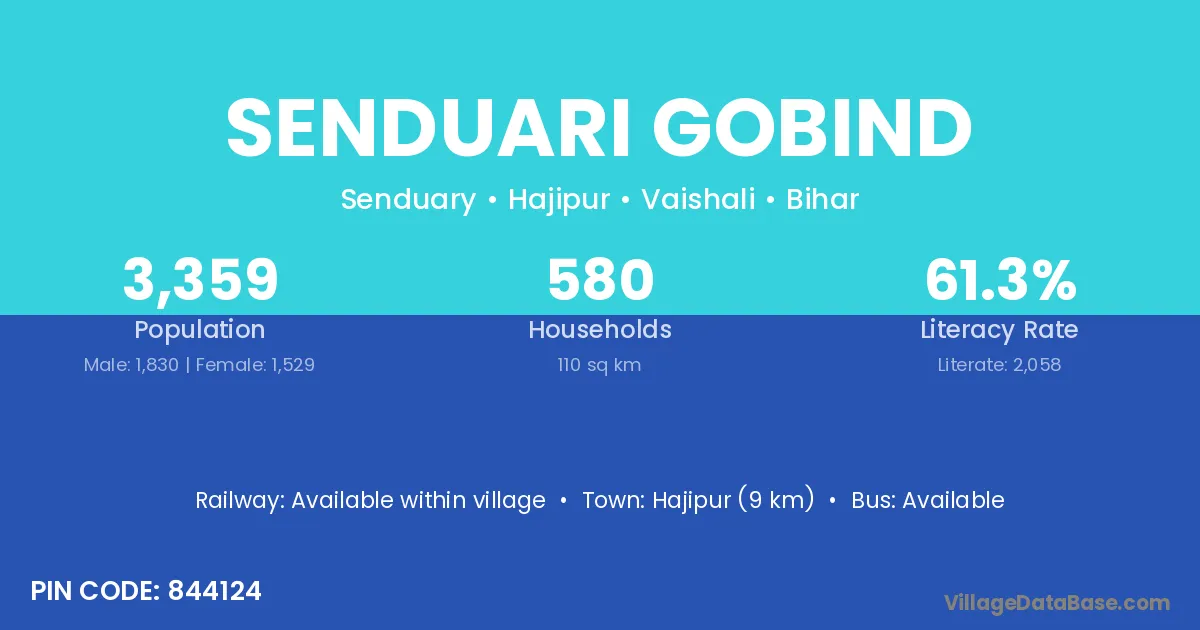 Hajipur (9 km) is the nearest town to Senduari Gobind village for major economic activities and is located approximately 9 km away.
