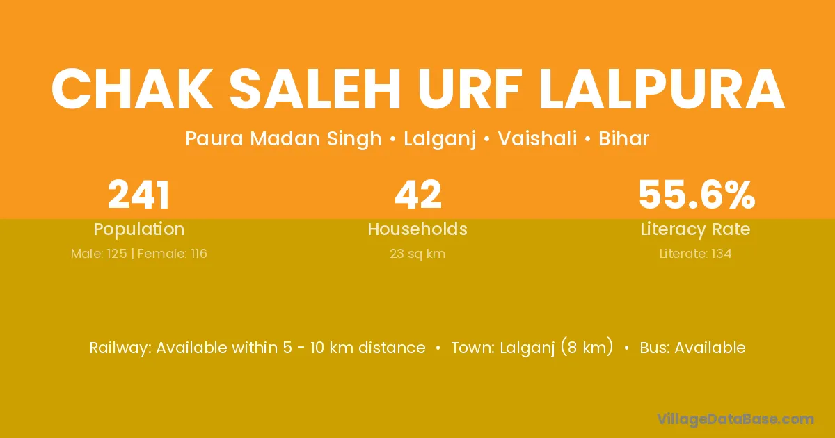 Lalganj (8 km) is the nearest town to Chak Saleh Urf Lalpura village for major economic activities and is located approximately 8 km away.
