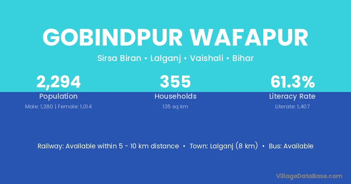 Lalganj (8 km) is the nearest town to Gobindpur Wafapur village for major economic activities and is located approximately 8 km away.