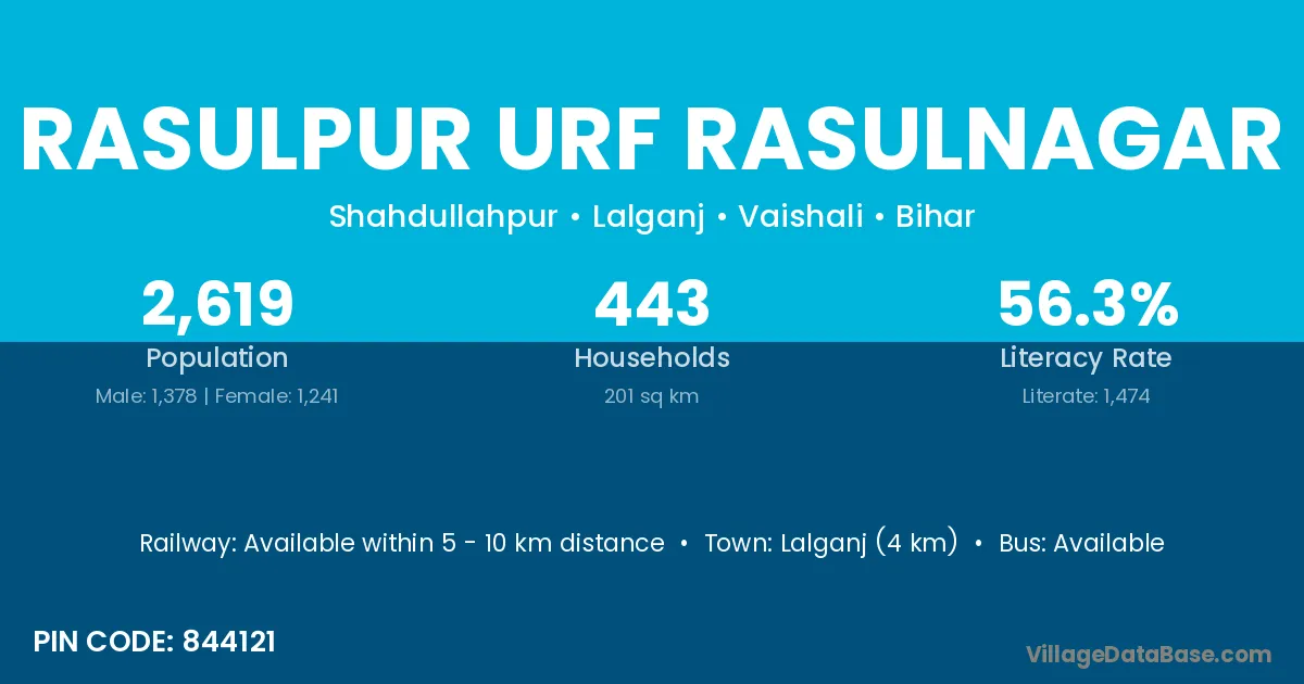 Lalganj (4 km) is the nearest town to Rasulpur Urf Rasulnagar village for major economic activities and is located approximately 4 km away.