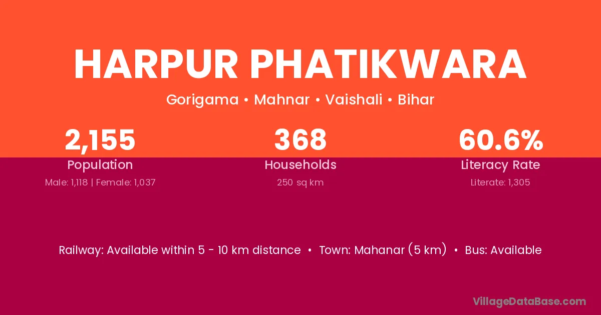 Mahanar (5 km) is the nearest town to Harpur Phatikwara village for major economic activities and is located approximately 5 km away.