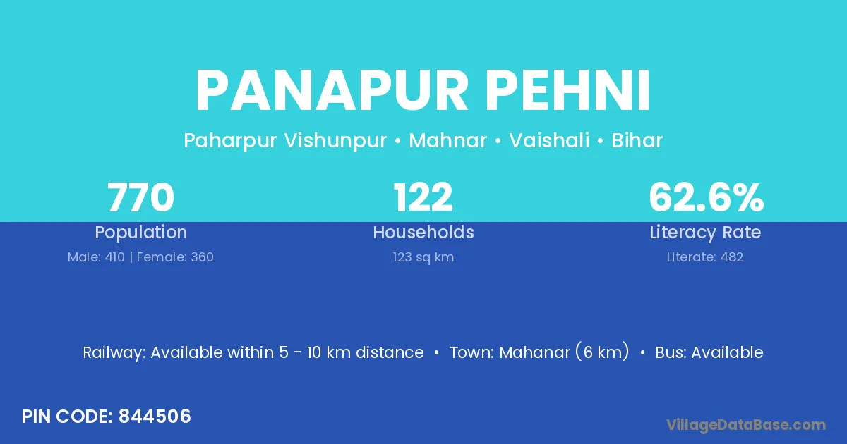 Mahanar (6 km) is the nearest town to Panapur Pehni village for major economic activities and is located approximately 6 km away.
