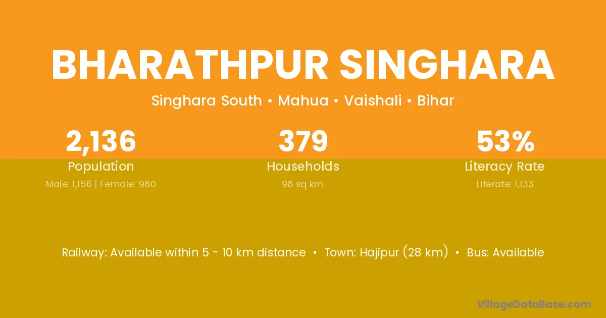 Hajipur (28 km) is the nearest town to Bharathpur Singhara village for major economic activities and is located approximately 28 km away.