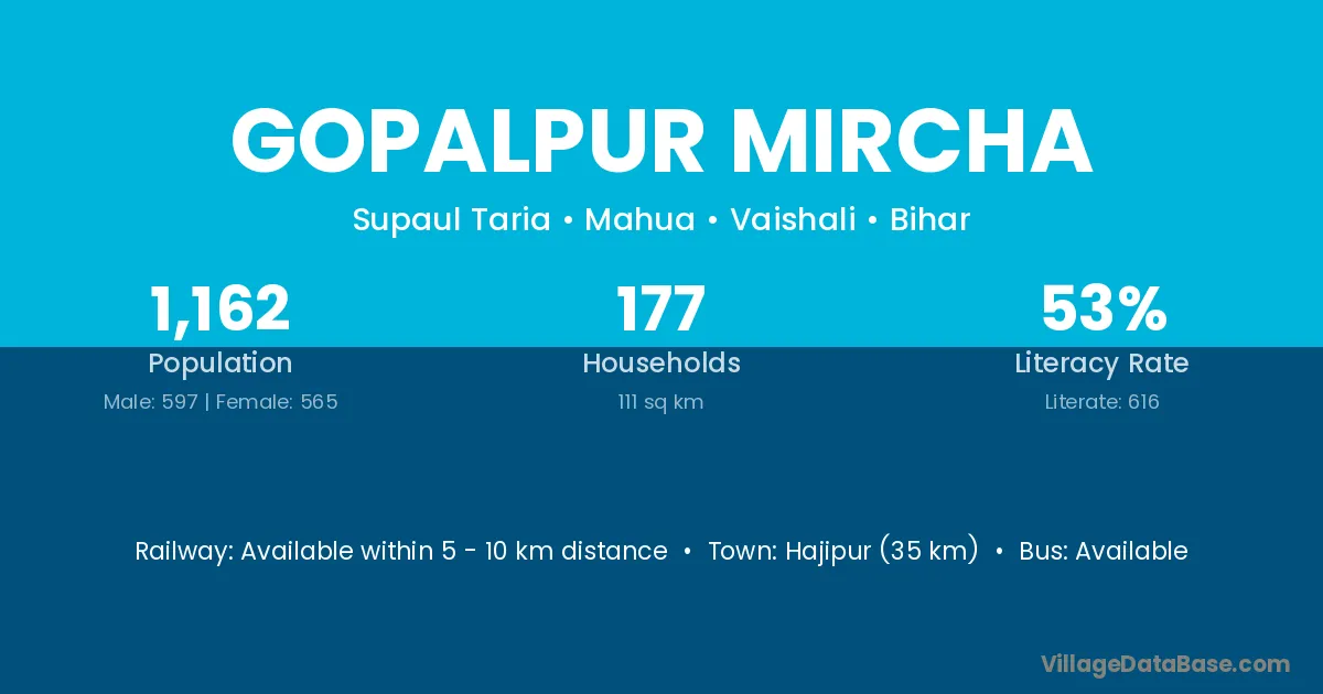 Hajipur (35 km) is the nearest town to Gopalpur Mircha village for major economic activities and is located approximately 35 km away.