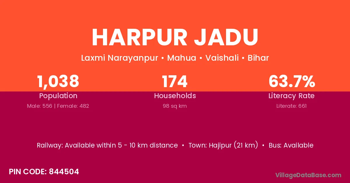 Hajipur (21 km) is the nearest town to Harpur Jadu village for major economic activities and is located approximately 21 km away.