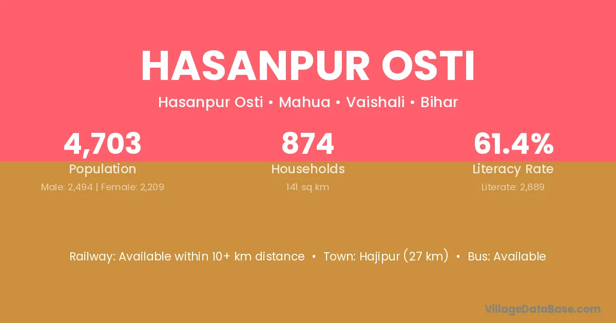 Hajipur (27 km) is the nearest town to Hasanpur Osti village for major economic activities and is located approximately 27 km away.