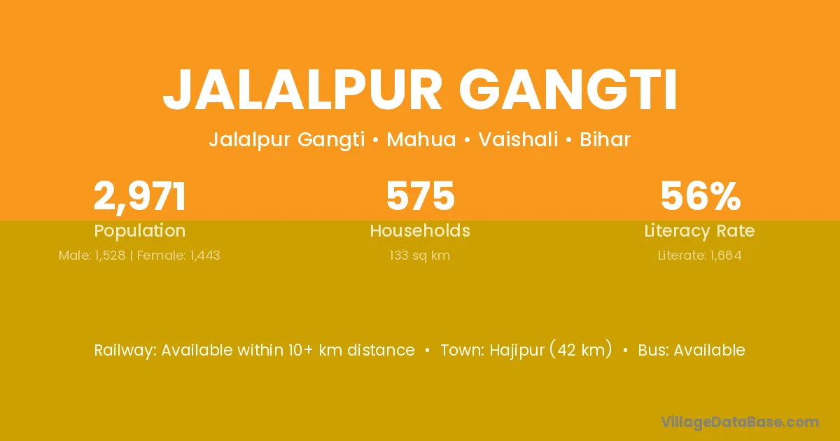 Hajipur (42 km) is the nearest town to Jalalpur Gangti village for major economic activities and is located approximately 42 km away.