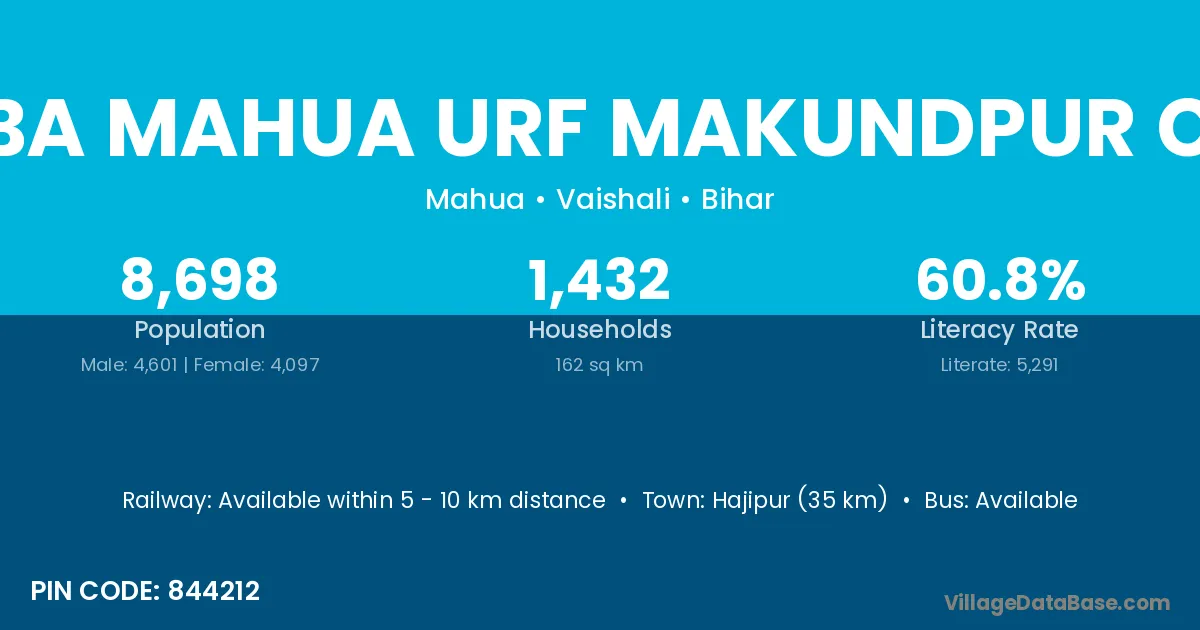 Kasba Mahua Urf Makundpur Chak village has a total population of 8,698 people, of which 4,601 are males and 4,097 are females.