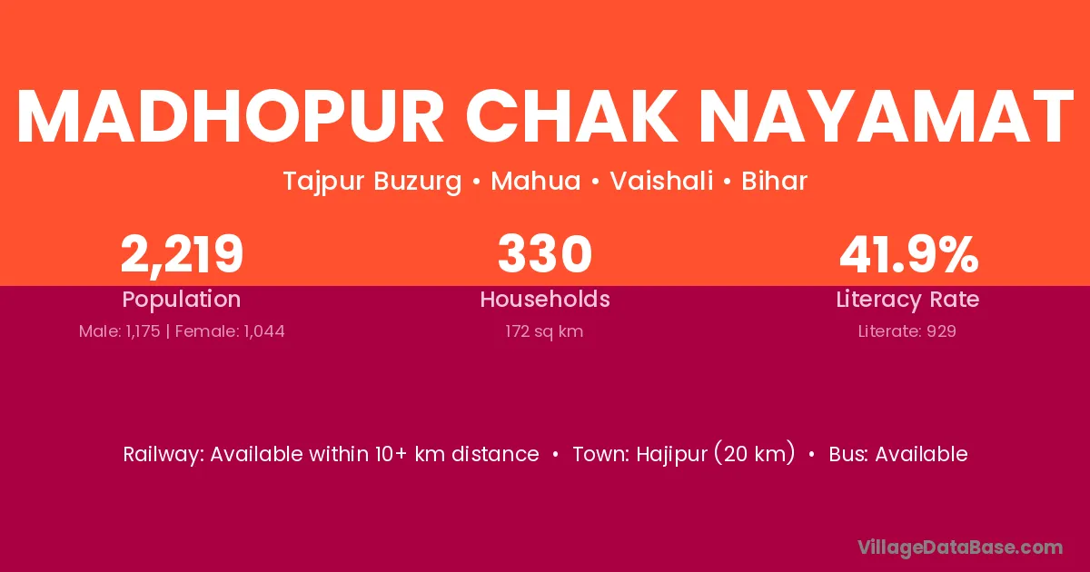 Hajipur (20 km) is the nearest town to Madhopur Chak Nayamat village for major economic activities and is located approximately 20 km away.