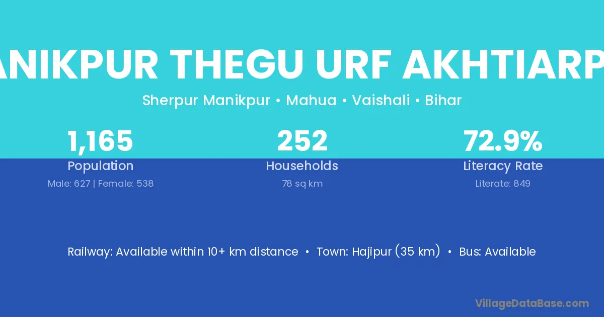 Hajipur (35 km) is the nearest town to Manikpur Thegu Urf Akhtiarpur village for major economic activities and is located approximately 35 km away.