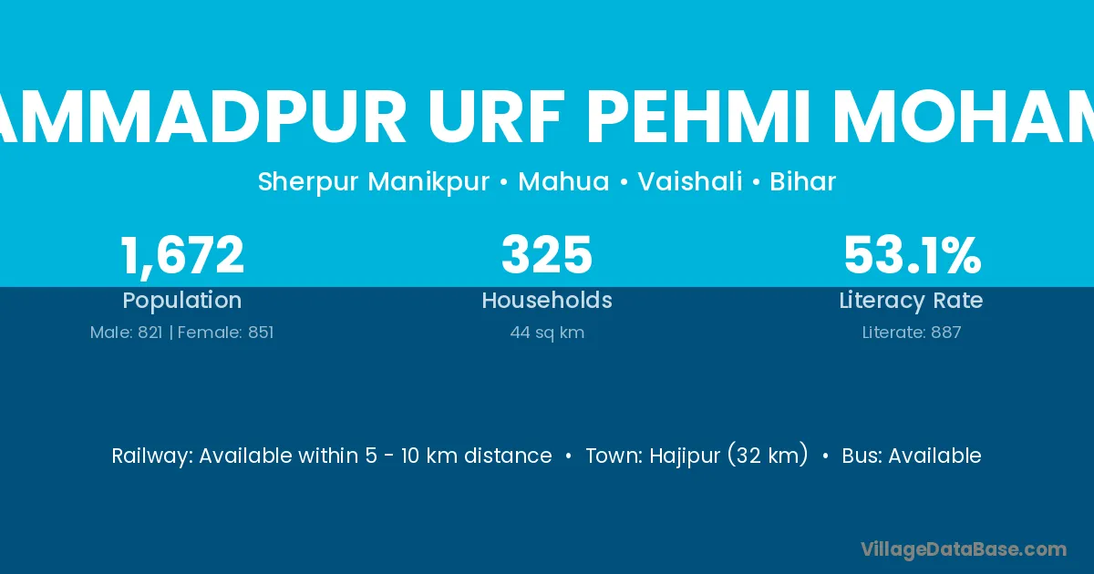 Hajipur (32 km) is the nearest town to Mohammadpur Urf Pehmi Mohammad village for major economic activities and is located approximately 32 km away.